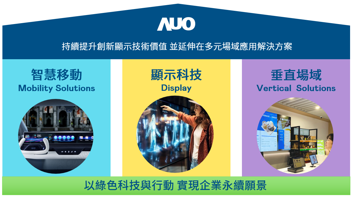 我們持續推動「雙軸轉型」,在精進顯示技術附加價值(Go Premium),與深化垂直市場應用(Go Vertical)的策略下,對應j9九游会首页登录的優勢競爭力與趨勢,我們奠定顯示技術、智慧移動、垂直場域三大永續營運支柱,在顯示技術領域的根基之上,延伸布局多元場域應用解決方案。將先進顯示科技助力智慧移動及垂直場域發展,並以綠色科技與行動為實踐,在轉型之路上貫徹永續經營之願景。